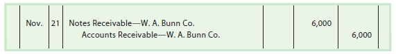To illustrate, assume that a company accepts a 30-day, 12% note dated November 21, 2014, in settlement of the account of W. A. Bunn Co., which is past due and has a balance of $6,000. The company records the receipt of the note as follows: