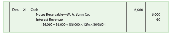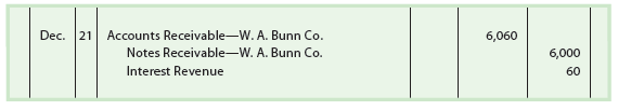 If the maker of a note fails to pay the note on the due date, the note is a dishonored note receivable. A company that holds a dishonored note transfers the face amount of the note plus any interest due back to an accounts receivable account. For example, assume that the $6,000, 30-day, 12% note received from W. A. Bunn Co. and recorded on November 21 is dishonored. The company holding the note transfers the note and interest back to the customer’s account as follows:
