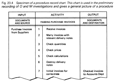 Mention has already been made of the process analysis flow chart and the procedure statement and procedure narrative. Many other charts are used by practitioners of O and M, specimens of two of which are given in Figures 23.4 and 23.5.