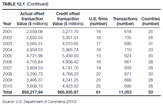 Offsets in defense trade encompass a range of industrial compensation arrangements required by foreign governments as a condition of the purchase of defense articles and services from a nondomestic source. This mandatory compensation can be directly related to the purchased defense article or service, or it can involve activities or goods unrelated to the defense sale. The U.S. government policy on offsets in defense trade states that the government considers offsets to be “economically inefficient and trade distorting,” and it prohibits any agency of the U.S. government from encouraging, entering directly into, or committing U.S. firms to any offset arrangement in connection with the sale of defense articles or services to foreign governments. U.S. defense contractors generally see offsets as a reality of the marketplace for companies competing for international defense sales (See Tables 12.1 and 12.2). Several U.S. defense contractors acknowledge that offsets are usually necessary in order to make defense sales—sales that can help support the U.S. industrial base. U.S. firms are required to report annually on contracts for the sale of defense articles or defense services to foreign governments or foreign firms that are subject to offset agreements exceeding $5 million in value and on offset transactions completed in performance of existing offset commitments for which offset credit of $250,000 or more has been claimed from the foreign representative (U.S. Department of Commerce, 2012).