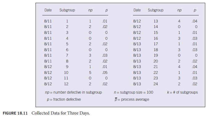 When we left the pen makers, they seemed to have gotten their defective pens down to 2% or less. If we pick it up from there, we will need several subgroup samples of data to establish the limits and process average for our chart. The p-chart construction process is very similar to that of the X- and P-charts discussed in the preceding section. For attributes data, the subgroup sample size should be larger. We need to have a sample size (n) large enough that we are likely to include the defectives. Let’s use n = 100. We want the interval between sample groups wide enough that if trends develop, we will see them. If the factory makes 2,000 pens of this type per hour and we sample the first 100 after the hour, in an eight-hour day we can obtain eight samples. Three days of sampling will give us sufficient data to construct our p-chart. After three days of collecting data, we have the data shown in Figure 18.11. To that data, we’ll apply the p-chart formulas shown in Figure 18.12.