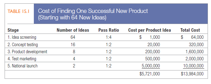 Table 15.1 shows how a company might calculate the cost of new-product development. The new-products manager at a large consumer packaged-goods company reviewed 64 ideas. Sixteen passed the screening stage and cost $1,000 each to review at this point. Half, or eight, survived the concept-testing stage, at a cost of $20,000 each. Four survived the product-development stage, at a cost of $200,000 each. Two did well in the test market, costing $500,000 each. When they were launched, at a cost of $5 million each, one was highly successful. Thus, this one successful idea cost the company $5,721,000 to develop, while 63 others fell by the wayside for a total development cost of $13,984,000. Unless the company can improve its pass ratios and reduce costs at each stage, it will need to budget nearly $14 million for each successful new idea it hopes to find.