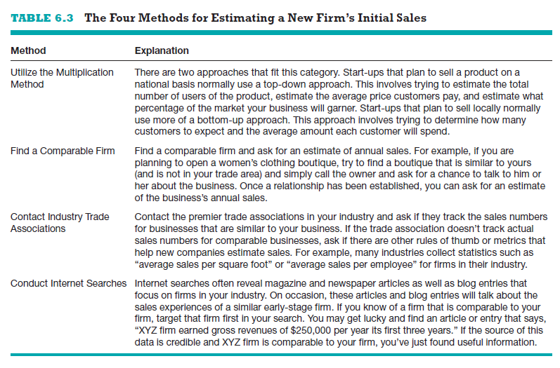 The final section of the market analysis estimates a firm’s annual sales and market share. There are four basic ways for a new firm to estimate its initial sales. If possible, more than one method should be used to complete this task. The most important outcome is to develop an estimate that is based on sound assumptions and seems both realistic and attainable. We show the four meth- ods entrepreneurs can use to estimate sales in Table 6.3.