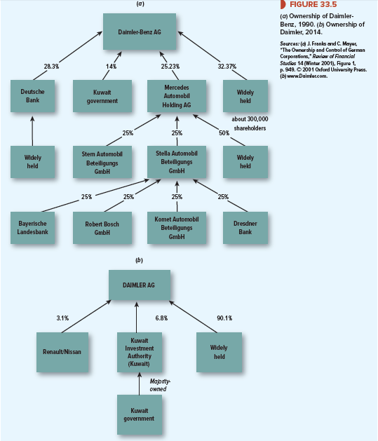 Panel a of Figure 33.5 shows the 1990 ownership structure of Daimler, or as it was known then, Daimler-Benz. The immediate owners were Deutsche Bank with 28%, Mercedes Auto- mobil Holding with 25%, and the Kuwait Government with 14%. The remaining 32% of the shares were widely held by about 300,000 individual and institutional investors. But this was only the top layer. Mercedes Automobil’s holding was half owned by holding companies “Stella” and “Stern,” for short. The rest of its shares were widely held. Stella’s shares were in turn split four ways: between two banks, Robert Bosch, an industrial company, and another holding company, “Komet.” Stern’s ownership was split five ways but we ran out of space.