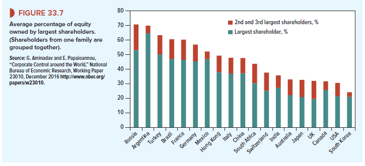 Figure 33.7 repeats Figure 14.5, and shows the concentration of ownership in different countries. In the United States, Canada, South Korea, and Japan ownership of listed companies tends to be relatively dispersed, but Figure 33.7 shows that this is not true everywhere. For example, in France and Germany, the largest shareholder owns, on average, nearly half of the outstanding stock. Ownership is even more concentrated in Russia and Argentina.