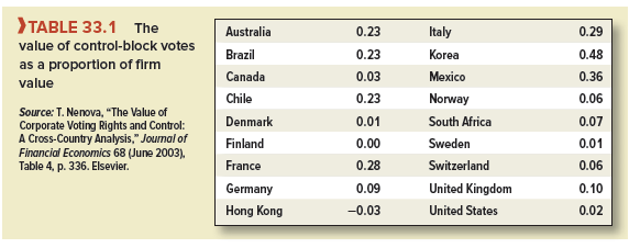 As we briefly discussed in Chapter 14, there is a wide variation in the value of votes across countries. Table 33.1 shows Tatiana Nenova’s estimates of the value of controlling blocks in different countries, calculated as a fraction of firms’ market values. These values are calculated from the differences in prices between ordinary shares and shares with extra votes. The range of values is large. For example, the Scandinavian countries have uniformly low premiums for control. South Korea and Mexico have very high control premiums.
