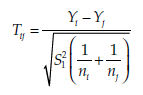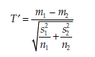 This statistic T’ is called an Aspin-Welch test. It approximates a Student T distribution in which the number of degrees of freedom v is the closest integer value to the result of the following formula: