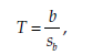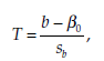 where b represents the regression coefficient P and s_ its standard deviation, both estimated from the sample. The statistic T follows a Student distribution with n – 2 degrees of freedom.