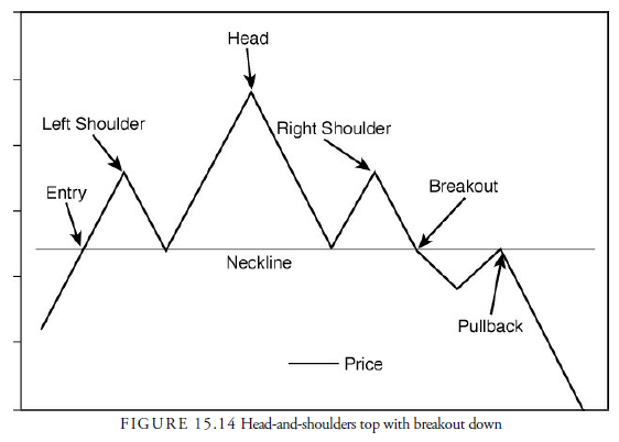 An uptrend, but not necessarily a long-term trend, precedes a head-and-shoulders top. Thus, as shown in Figure 15.14, the head-and-shoulders top pattern is entered from below. (The head-and-shoulders pattern can also occur within a consolidation rather than at the end of a trend, but such occurrences are rare and more likely a series of triangles or a rectangle with a false downward breakout at the “head.”)