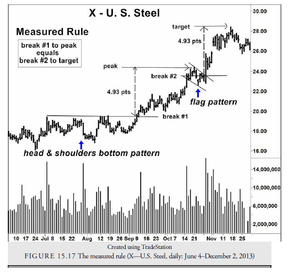 One of the most important identification features is the steep trend preceding the pattern. It is important to be cautious to make sure that a complete formation has occurred and to wait for the breakout. The breakout occurs when a trend line is broken, usually in the direction of the preceding trend. The price target for these patterns is calculated by taking the distance from the beginning of the sharp trend, not necessarily the beginning of the entire trend, to the first reversal in the pattern and adding it to the breakout price. This method is called the measured rule (see Figure 15.17) and usually applies only to flags and pennants. It implies that the formation will occur roughly halfway through the entire steep price trend; because of this, these patterns are also called half-mast patterns. The projection of a target is only partially accurate (about 60% of the time), but because of the steepness of the subsequent trend, close trailing stops are the best manner of protecting profits.