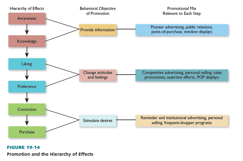 In reacting to a retailer’s communication efforts, consumers often go through a sequence of steps known as the, hierarchy of effects, which takes them from awareness, to knowledge, to liking, to preference, to conviction, to purchase. Different promotional mixes are needed in each step. Ads and public relations are best to develop awareness; personal selling and sales promotion are best in changing attitudes and stimulating desires. This is especially true for expensive, complex goods and services. See Figure 19-14.