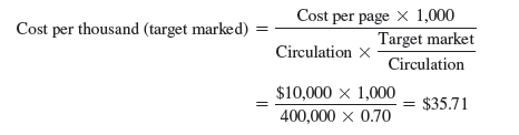 In this computation, total circulation is used to measure efficiency. Yet, because a retailer usually appeals to a limited target market, only the relevant portion of circulation should be considered. If 70 percent of readers are target customers for a particular firm (and the other 30 percent live outside the trading area), the real cost per thousand is: