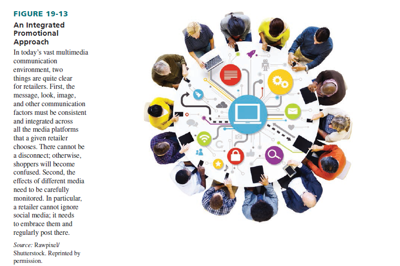 After a budget is set, the promotional mix is determined: the retailer’s combination of advertising, public relations, personal selling, and sales promotion. A firm with a limited budget may rely on store displays, Web site traffic, flyers, targeted direct mail, and publicity to generate customer traffic. One with a large budget may rely more on newspaper and TV ads. Retailers often use an assortment of forms to reinforce each other. A melding of media ads and point-of-purchse displays may be more effective than either form alone. See Figure 19-13.