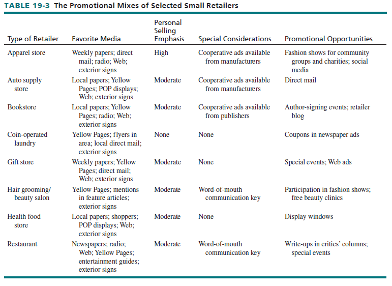 The promotional mix is affected by the type of retailer involved. In supermarkets, sampling, frequent shopper promotions, theme sales, and bonus coupons are among the techniques used most. At upscale stores, there is more attention to personal selling and less to advertising and sales promotion as compared with discounters. Table 19-3 shows a number of small-retailer promotional mixes.