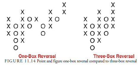 The other variable in a point and figure chart is the reversal amount. In our previous example, we used one point for both the box plot and the reversal amount. We could have expanded that reversal amount to three or five boxes, however. In other words, we could keep the one-point box scale but only record a reversal to the next column when the price reversed by three boxes. This also cuts down on the noise in price action and lengthens the time over which price action is recorded. Figure 11.14 shows a hypothetical increase in the number of boxes necessary for a reversal. Again, it reduces the noise and condenses the chart. One other attribute is that, unlike the one-box reversal, a complete data stream of prices is unnecessary, and the plot can be accomplished from data in the morning paper. It is for this reason that the three-box reversal became popular; it eliminated the tedious necessity of looking at every trade.