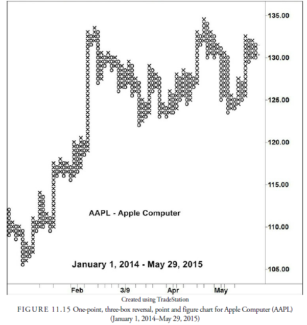As an example, Figure 11.15 shows a one-point, three-box reversal chart of AAPL prices from January 1, 2014, through May 29, 2015. The plot itself is a little different from the pure one-point, one-box reversal chart. Xs are used for the column in which prices are rising, and Os are used for the column in which prices are declining. This gives an easier-to-read picture of the price history.