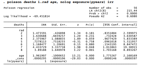 . poisson deaths i(1/6).rad rad78 age, irr ex(pyears) nolog