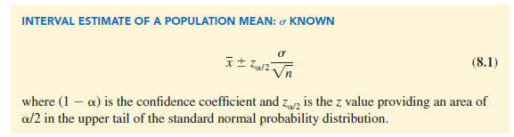 In order to develop an interval estimate of a population mean, either the population standard deviation s or the sample standard deviation 5 must be used to compute the margin of error. In most applications s is not known, and 5 is used to compute the margin of error. In some applications, large amounts of relevant historical data are available and can be used to estimate the population standard deviation prior to sampling. Also, in quality control applications where a process is assumed to be operating correctly, or “in control,” it is appropriate to treat the population standard deviation as known. We refer to such cases as the σ known case. In this section we introduce an example in which it is reasonable to treat s as known and show how to construct an interval estimate for this case.