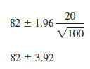 Thus, using expression (8.1), the margin of error is 3.92 and the 95% confidence interval is 82 – 3.92 = 78.08 to 82 + 3.92 = 85.92.