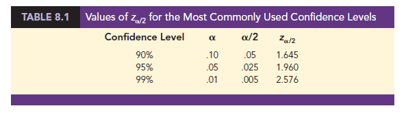 Although a 95% confidence level is frequently used, other confidence levels such as 90% and 99% may be considered. Values of za/2 for the most commonly used confidence levels are shown in Table 8.1. Using these values and expression (8.1), the 90% confidence interval for the Lloyd’s example is