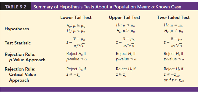 We presented examples of a lower tail test and a two-tailed test about a population mean. Based upon these examples, we can now summarize the hypothesis testing procedures about a population mean for the s known case as shown in Table 9.2. Note that m0 is the hypothesized value of the population mean.