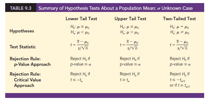Table 9.3 provides a summary of the hypothesis testing procedures about a population mean for the s unknown case. The key difference between these procedures and the ones for the s known case is that 5 is used, instead of s, in the computation of the test statistic. For this reason, the test statistic follows the t distribution.