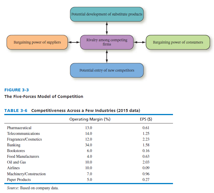 Former chair and CEO of PepsiCo Wayne Calloway said, “Nothing focuses the mind better than the constant sight of a competitor that wants to wipe you off the map.” As illustrated in Figure 3-3, Porter’s Five-Forces Model of competitive analysis is a widely used approach for developing strategies in many industries. The intensity of competition among firms varies widely across industries. Table 3-6 reveals the average gross profit margin and earnings per share (EPS) for firms in different industries. Note the substantial variation among industries. For example, note that industry operating margins range from 4 to 34 percent, whereas industry EPS values range from -16 to 2.23. Note that food manufacturers have the lowest average profit margin (2.3), which implies fierce competition in that industry. Intensity of competition is highest in lower-return industries. The collective impact of competitive forces is so brutal in some industries that the market is clearly “unattractive” from a profit-making standpoint. Rivalry among existing firms is severe, new rivals can enter the industry with relative ease, and both suppliers and customers can exercise considerable bargaining leverage. According to Porter, a Harvard Business School professor, the nature of competitiveness in a given industry can be viewed as a composite of five forces:
