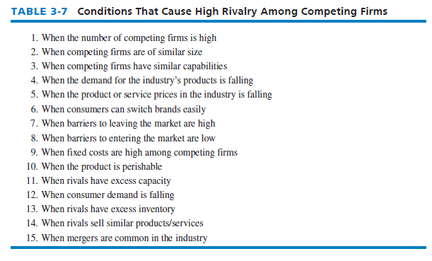 The intensity of rivalry among competing firms tends to increase as the number of competitors increases, as competitors become more equal in size and capability, as demand for the industry’s products declines, and as price cutting becomes common. Rivalry also increases when consumers can switch brands easily; when barriers to leaving the market are high; when fixed costs are high; when the product is perishable; when consumer demand is growing slowly or declines such that rivals have excess capacity or inventory; when the products being sold are commodities (not easily differentiated, such as gasoline); when rival firms are diverse in strategies, origins, and culture; and when mergers and acquisitions are common in the industry. As rivalry among competing firms intensifies, industry profits decline, in some cases to the point where an industry becomes inherently unattractive. When rival firms sense weakness, typically they will intensify both marketing and production efforts to capitalize on the “opportunity.” Table 3-7 summarizes conditions that cause high rivalry among competing firms.