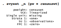Any number of weight variables can exist in the same dataset, and svyset used repeatedly to select among them as needed for particular analysis. The weights affect analysis only when we apply them through svy: or other explicitly weighted commands. For the remainder of this chapter, we return to the Granite State Poll weighted by censuswt, a variable calculated by the UNH Survey Center to combine design weighting (for number of adults, and number of phone lines) with poststratification (for gender and region within New Hampshire).