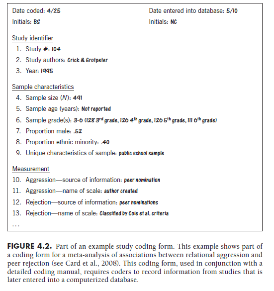 Considering first the interface coders use to record information, three options include using paper forms that coders complete, using a computerized form to collect this information, or coding directly into the electronic format to be used for analyses. Part of an example paper coding form (from a meta-analysis of the association between relational aggression and peer rejection described throughout this book; Card et al., 2008) is shown in Figure 4.2.
