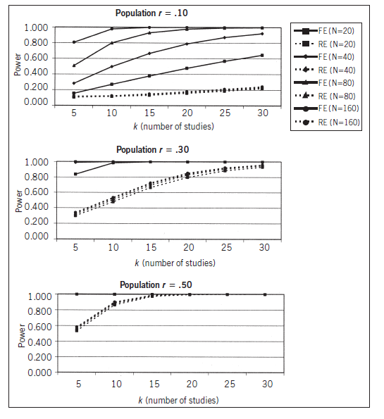 A third consideration is the relative statistical power of fixed- versus random-effects models (or fixed-effects with moderators versus mixed- effects models). The statistical power of a meta-analysis depends on many factors—number of studies, sample sizes of studies, degree to which effect sizes must be corrected for artifacts, magnitude of population variance in effect size, and of course true mean population effect size. Therefore, it is not a straightforward computation (see e.g., Cohn & Becker, 2003; Field, 2001; Hedges & Pigott, 2001, 2004). However, to illustrate this difference in power between fixed- and random-effects models, I have graphed some results of a simulation by Field (2001), shown in Figure 10.4. These plots make clear the greater statistical power of fixed-effects versus random-effects models. More generally, fixed-effects analyses will always provide as high (when t2 = 0) or higher (when t2 > 0) statistical power than random-effects models. This makes sense in light of my earlier observation that the random-effects weights are always smaller than the fixed-effects weights; therefore, the sum of weights is smaller and the standard error of the average effect size is larger for random- than for fixed-effects models. Similarly, analysis of moderators in fixed-effects models will provide as high or higher statistical power as mixed-effects models. For these reasons, it may seem that this consideration would always favor fixed-effects models. However, this conclusion must be tempered by the inappropriate precision associated with high statistical power when a fixed-effects model is used inappropriately in the presence of substantial variance in population effect sizes (see below). Nevertheless, statistical power is one important consideration in deciding among models: If you have questionable statistical power (small number of studies and/or small sample sizes) to detect the effects you are interested in, and you are comfortable with the other considerations, then you might choose a fixed- effects model.