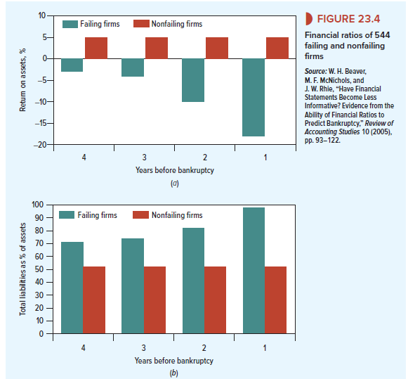 Suppose that you are given the task of developing a system that will help to decide which businesses are poor credits. You start by comparing the financial statements of companies that went bankrupt over a 40-year period with those of surviving firms. Figure 23.4 shows what you find. Panel (a) illustrates that, as early as four years before they went bankrupt, failing firms were earning a much lower return on assets (ROA) than firms that survived. Panel (b) shows that, on average, they also had a high ratio of liabilities to assets, and Panel (c) shows that EBITDA (earnings before interest, taxes, and depreciation) was low relative to the firms’ total liabilities. In each case, these indicators of the firms’ financial health steadily deteriorated as bankruptcy approached.