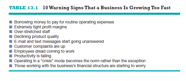 Other businesses have faced similar dilemmas and have sometimes made the right call, and other times haven’t. The overarching point is that growth must be handled carefully. As we emphasize throughout this chapter, a business can only grow as fast as its infrastructure allows. Table 13.1 provides a list of 10 warning signs that a business is growing too fast.