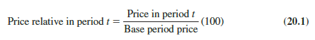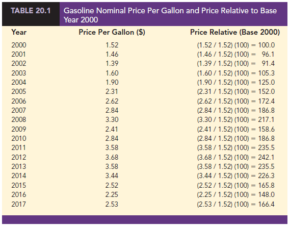 The simplest form of a price index shows how the current price per unit for a given item compares to a base period price per unit for the same item. For example, Table 20.1 reports the cost of one gallon of gasoline for the years 2000 through 2017. To facilitate comparisons with other years, the actual cost-per-gallon figure can be converted to a price relative, which expresses the unit price in each period as a percentage of the unit price in a base period.