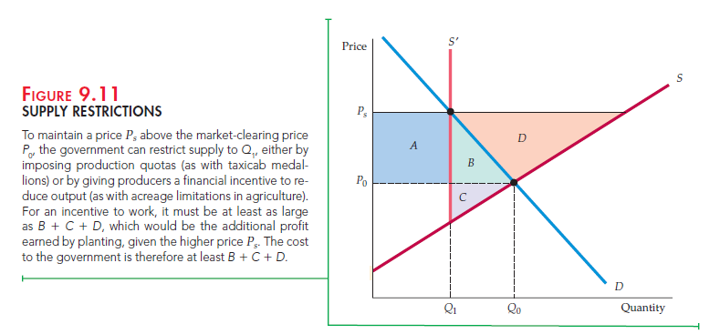 The welfare effects of production quotas are shown in Figure 9.11. The government restricts the quantity supplied to Q1, rather than the market- clearing level Q0. Thus the supply curve becomes the vertical line S’ at Q1. Consumer surplus is reduced by rectangle A (those consumers who buy the good pay a higher price) plus triangle B (at this higher price, some consum- ers no longer purchase the good). Producers gain rectangle A (by selling at a higher price) but lose triangle C (because they now produce and sell Q1 rather than Q0). Once again, there is a deadweight loss, given by triangles B and C.