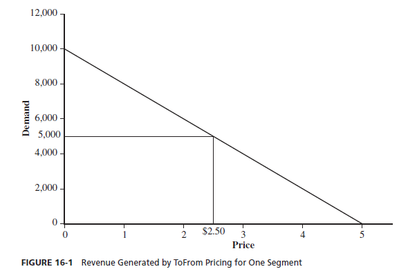 where d is the demand across all segments and p is the transport cost per cubic foot. A price of $2 per cubic foot results in a demand of 6,000 cubic feet (all customers willing to pay $2 or more), revenue of $12,000, and a profit of $3,000, whereas a price of $3.50 per cubic foot results in a demand of 3,000 (only customers willing to pay $3.50 or more), revenue of $10,500, and a profit of $1,500. The real question is whether the 3,000 cubic feet of demand at a price of $3.50 can be separated from the 3,000 additional cubic feet of demand generated at a price of $2 per cubic foot. If ToFrom assumes that all demand comes from a single segment and cannot be separated, the optimal price is $2.50 per cubic foot, resulting in a demand of 5,000 cubic feet and revenue of $12,500, as shown in Figure 16-1.