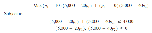 Now, let us consider the case in which total production capacity is limited to 4,000 units. The optimal differential price results in demand that exceeds total production capacity. Thus, we resort to the formulation in Equation 16.2 and solve