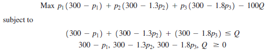 Maxp1(300 – p1) + p2(300 – 1.3p2) + p3(300 – 1.8p3)
