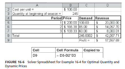 As formulated, the dynamic pricing problem is simple enough that it can be solved directly using Excel as illustrated in Example 16-3 [see worksheets Example16-3(dynamic price) and Example16-3(fixed price)].