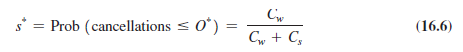 We now develop this trade-off in terms of a formula that can be used to set overbooking levels for an asset. Let p be the price at which each unit of the asset is sold, and let c be the cost of using or producing each unit of the asset. In case of asset shortage, let b be the cost per unit at which a backup can be used. Thus, the marginal cost of having wasted capacity is Cw = p — c, and the marginal cost of having a capacity shortage is Cs = b — p. If the cost of backup capacity is less than the sale price, there is no reason to limit the overbooking. The interesting case arises when the cost of backup capacity exceeds the sale price. The trade-off to obtain the optimal overbooking level is similar to the trade-off given by Equation 13.1 to obtain the optimal cycle service level for seasonal items. Let O* be the optimal overbooking level, and let / be the probability that cancellations will be less than or equal to O*. Similar to the derivation of Equation 13.1, the optimal overbooking level is obtained as