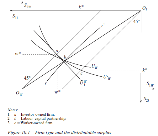 Let us assume that monitoring is extremely costly and ineffective. Effort incentives for the worker require a contract along rr’ in Figure 10.1. Let the diagonal through each origin in the diagram cut rr’ at b. In this set of circumstances, the optimal contract yields a labour-capital partnership. The worker does not receive a wage but a share in the distributable surplus. The worker’s share is Owb/OwOI.