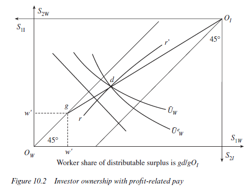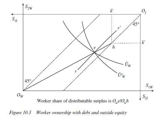 Figures 10.2 and 10.3 illustrate other sharing arrangements short of complete worker ownership. Figure 10.2 shows an investor-owned firm but with profit sharing. The contract is at point d. It implies a fixed wage of w’ and a share of the distributable surplus (now after the payment of wages) of gdIgOj. There is no debt finance. By contrast, in Figure 10.3 the contract point is at e. It shows a mainly worker-owned firm with some outside debt and equity. The wage is zero. The worker has a share in the distributable surplus (now after interest payments) of Owe/Owh. The outside investor receives the remaining share of the surplus and an interest payment ofOIk’.