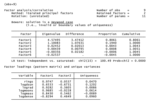 In this example, Stata gives an ominous warning: “Beware: solution is a Heywood case.” Clicking on the linked Heywood case warning yields an explanation of the problem which, in this instance, reflects our unusually small sample (n = 9). For simplicity, we will continue the analysis anyway, but in research such a warning should caution us to rethink our approach.