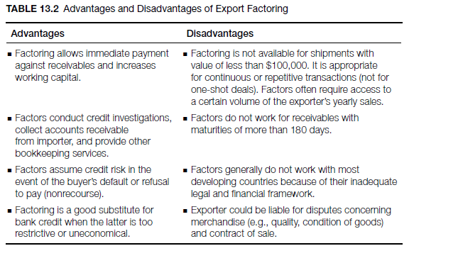 Arrangements with factors are made either with recourse (exporter is liable in the event of default by buyer or other problems) or without recourse, in which case a larger discount may be required since the exporter is free of liability. (For advantages and disadvantages of this financing method, see Table 13.2).