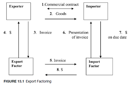 A typical export factoring procedure includes the following steps. Upon receipt of an order from an overseas customer, the exporter verifies with the factor, through its overseas affiliate, the customer’s credit standing and determines whether the factor is willing to authorize credit and to assume financial risk. If the factor’s decision is in favor of authorizing credit to the overseas customer, then the parties follow the procedure described in Figure 13.1.