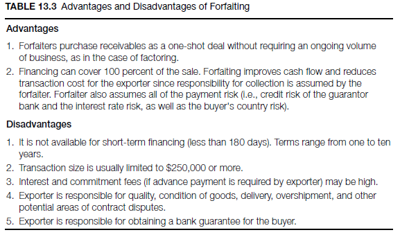 - Factors generally work with short-term receivables, whereas forfaiters finance receivables with a maturity of more than 180 days. (See Table 13.3 for advantages and disadvantages of this financing method.)