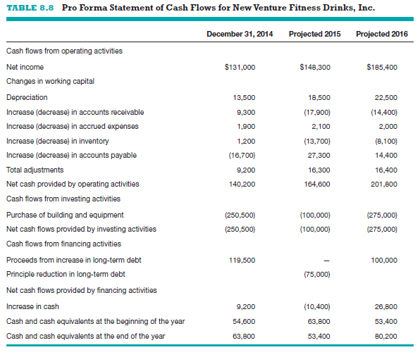 The pro forma consolidated statement of cash flows for New Venture Fitness Drinks is shown in Table 8.8. The figures appearing on the statement come directly, or are calculated directly, from the pro forma income statement and the pro forma balance sheet. The one exception is that the last line of each statement of cash flows, which reflects the company’s cash balance at the end of the period, becomes the first line of the company’s balance sheet for the next period. The pro forma statement of cash flows for New Venture Fitness Drinks shows healthy cash balances at the end of each projected period and shows that investment activities are being funded more by earnings than by debt. This scenario reflects a company that is generating sufficient cash flow to fund the majority of its growth without overly relying on debt or investment capital.