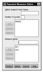 - Delete the factor 1 from the Within-Subject Factor Name box and replace it with the name time, our name for the repeated-measures independent variable that SPSS will generate.
