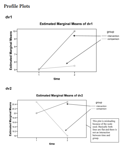 This example illustrates the utility of the doubly multivariate analysis for testing a pretest-posttest design with intervention and control groups. We see from these results not only that the intervention seemed successful when both outcome measures were taken together but also that the effect was statistically significant only for one of the dependent variables, when each was considered separately. Sphericity was not an issue in this case because there were only two levels of the within-subjects variable. If one creates difference scores by subtracting each person’s score on the dependent variable at one level of the within-subjects variable from the same dependent variable at each other level of the within-subjects variable, then sphericity exists if the variances of the resulting difference scores are all equal. Because there are only two levels of the within-subjects variable, there is only one set of difference scores, so sphericity has to exist, which is desirable. If we had had more than two levels of the within-subjects variable, then we would have needed to be concerned about the sphericity assumption when examining the univariate results. If epsilons did not approach 1.0, then we would have used the Huynh-Feldt or Greenhouse- Geisser test results, which use an estimate of epsilon to correct the degrees of freedom. Levene’s Test for homogeneity of variances was not significant, therefore this assumption was met.