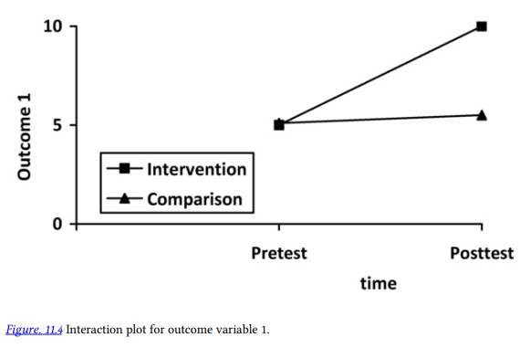 - Is there a difference between participants in the intervention group (group 1) and participants in the control group (group 2) in the amount of change that occurs over time in scores on two different outcome